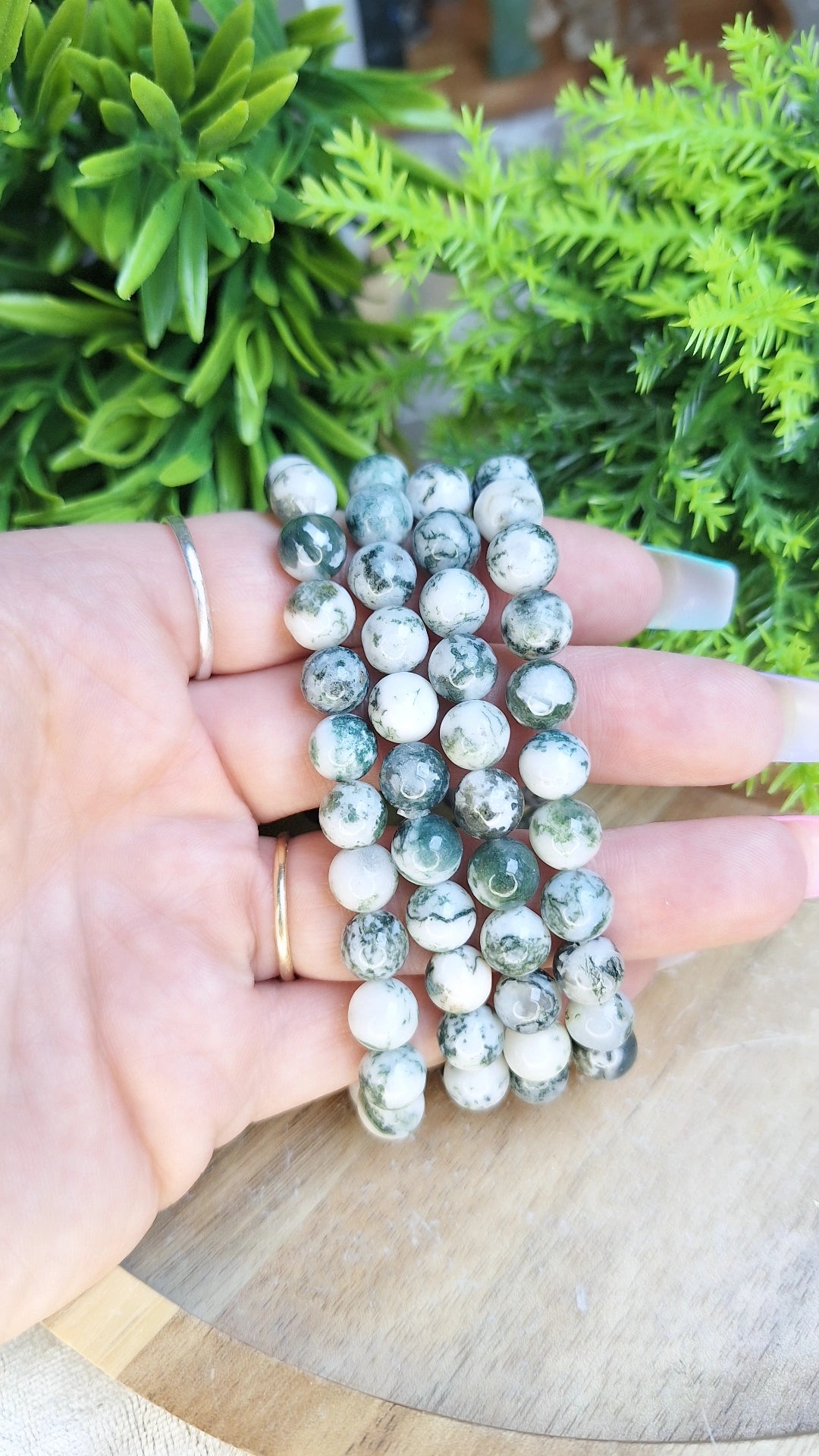 "Open your heart with this tree agate bracelet! The tree agate stone is known for its heart chakra healing properties, bringing balance and harmony to your emotional well-being. Wear this unique bracelet and feel the love!"
